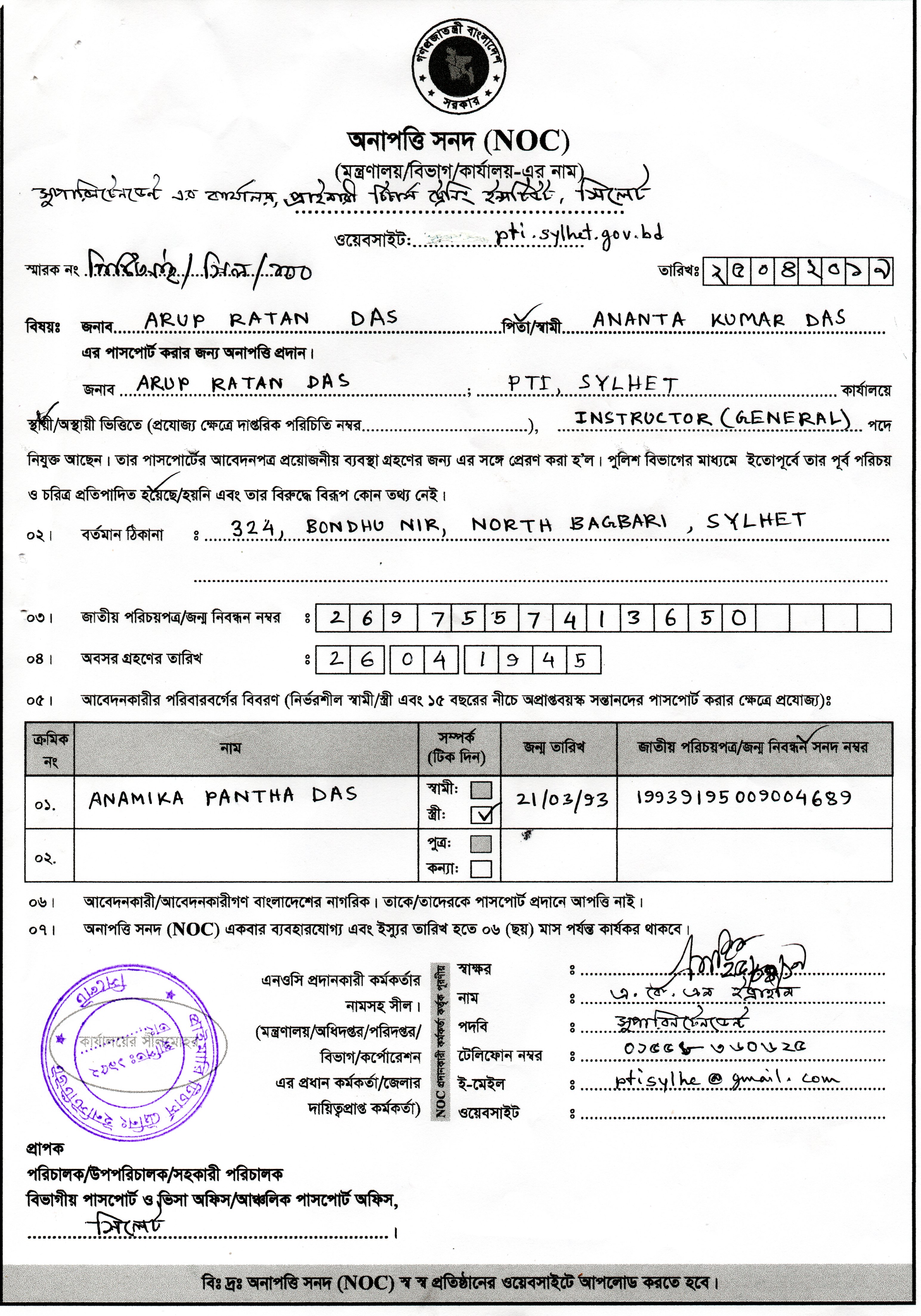 | ৮ | জনাব অরূপ রতন দাস এর পাসপোর্ট অনাপত্তি | ২৪-০৪-২০১৯ | |